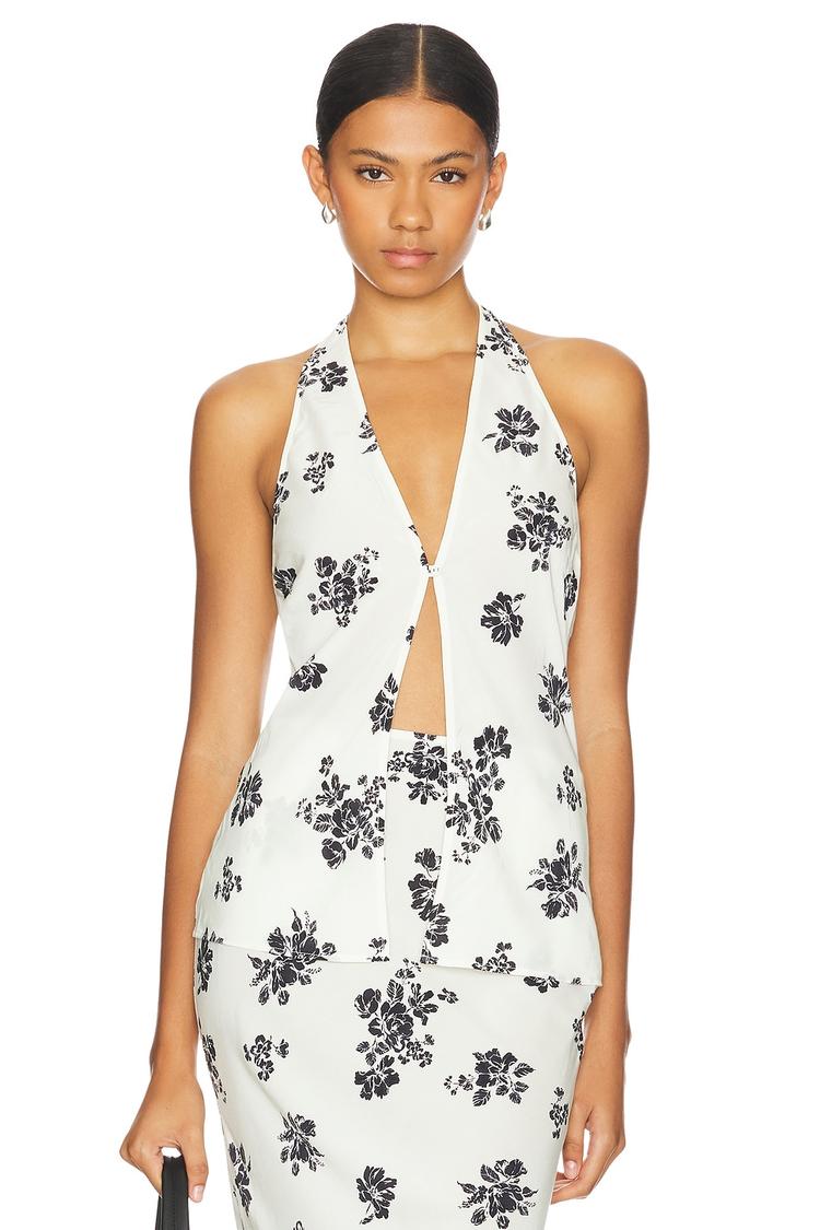A sultry plunge neckline and open back define this fitted camisole crafted from lightweight viscose fabric, featuring an all-over black floral print on a crisp white base. The sleeveless design with a single button closure at the front adds a modern, sexy edge while maintaining a chic silhouette at waist length. Ideal for spring and summer, this versatile piece is perfect for casual outings, brunch dates, or stylish nights out, blending effortless comfort with contemporary sophistication.