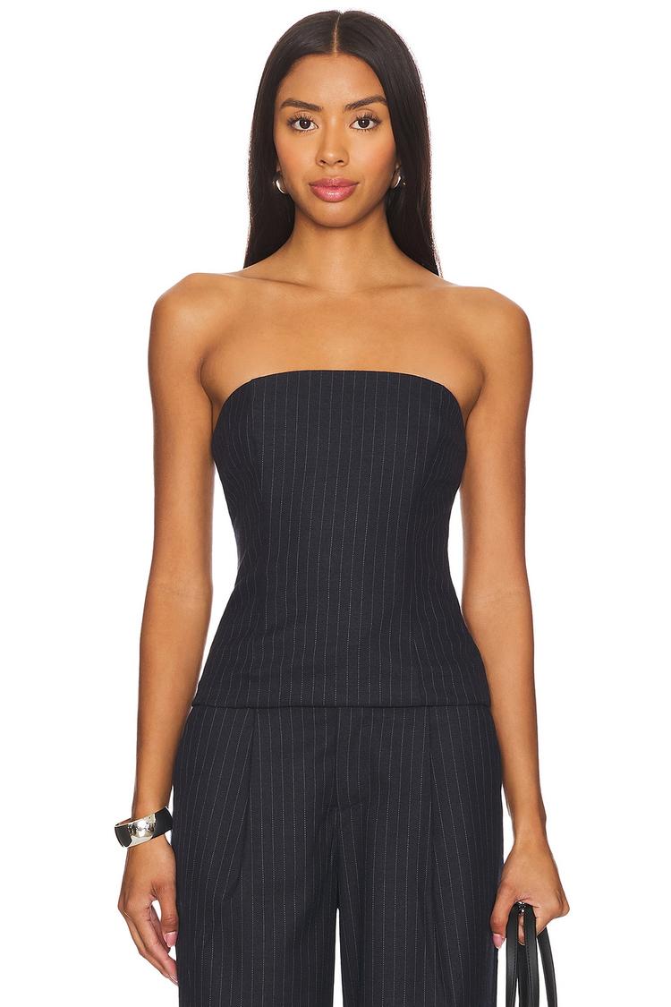Sleek and sophisticated, this fitted bandeau top features a straight neckline and strapless design perfect for warm weather or layering. Crafted from a smooth blend of polyester, viscose, wool, and elastane, it offers comfort and subtle stretch. The all-over pinstripe pattern in matte black and gray adds a modern edge to the waist-length silhouette. With a concealed back zipper and covered back, this versatile piece suits casual outings, date nights, and night outs with ease, combining chic style with effortless appeal.