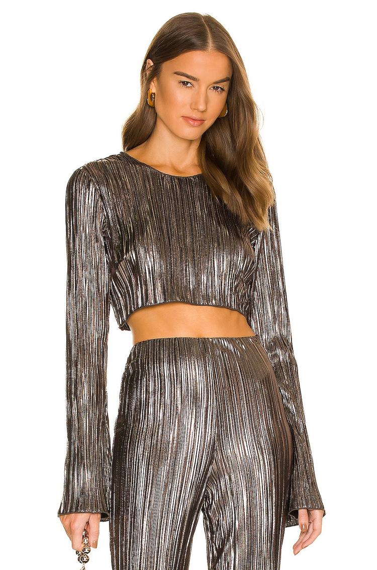 Metallic lurex fabric with a pleated texture brings a modern edge to this cropped top, featuring a flattering round neckline and long regular sleeves. The keyhole back with a loop button closure adds a subtle detail that enhances its sleek silhouette. Designed with a regular fit and cropped length, this piece shines for night outs, cocktail parties, or date nights, blending chic style with contemporary appeal. Its lightweight polyester and lurex blend ensures comfort and a shimmering finish perfect for making a statement after dark.