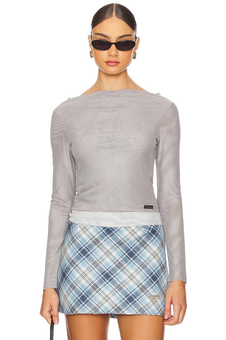 Lightweight mesh fabric and a close bodycon fit create a sleek silhouette with a modern minimalist vibe. This waist-length top features long regular sleeves and a subtle boat neckline for understated elegance. The pullover style enhances ease, while a silver logo pendant at the hem adds a refined detail. Perfect for casual days, streetwear looks, or everyday wear, this top blends comfort with chic sophistication, crafted from a recycled polyester and elastane blend that ensures breathability and stretch.