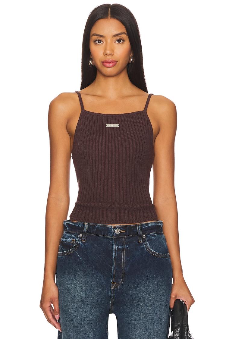 Rib-knit texture and a sleek square neckline define this fitted tank, crafted from a viscose-polyester-polyamide blend for comfortable stretch and breathability. The matte dark brown hue complements its minimalist design with slender spaghetti straps and a waist-length hem, making it an essential piece for casual outings, everyday wear, and relaxed loungewear. This pullover tank pairs effortlessly with jeans or skirts, offering a versatile foundation for your warm-weather wardrobe with a subtle, modern edge.
