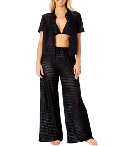 HURLEY WOMEN'S 2 PIECE CROCHET SWIM COVER UP SET, SHORT SLEEVE TOP AND PANT (BLACK, MEDIUM)