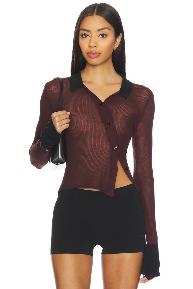 Sleek and sheer, this knit long-sleeve top features a slim fit that contours the waist, enhanced by a classic V-neck and front button closure. The matte dark brown fabric contrasts with black cuffed sleeves and collar, creating an edgy yet minimalist silhouette perfect for casual outings, streetwear looks, or a night out. Its waist-length cut offers versatile styling options, making it a chic layering piece for spring, autumn, or winter wardrobes.