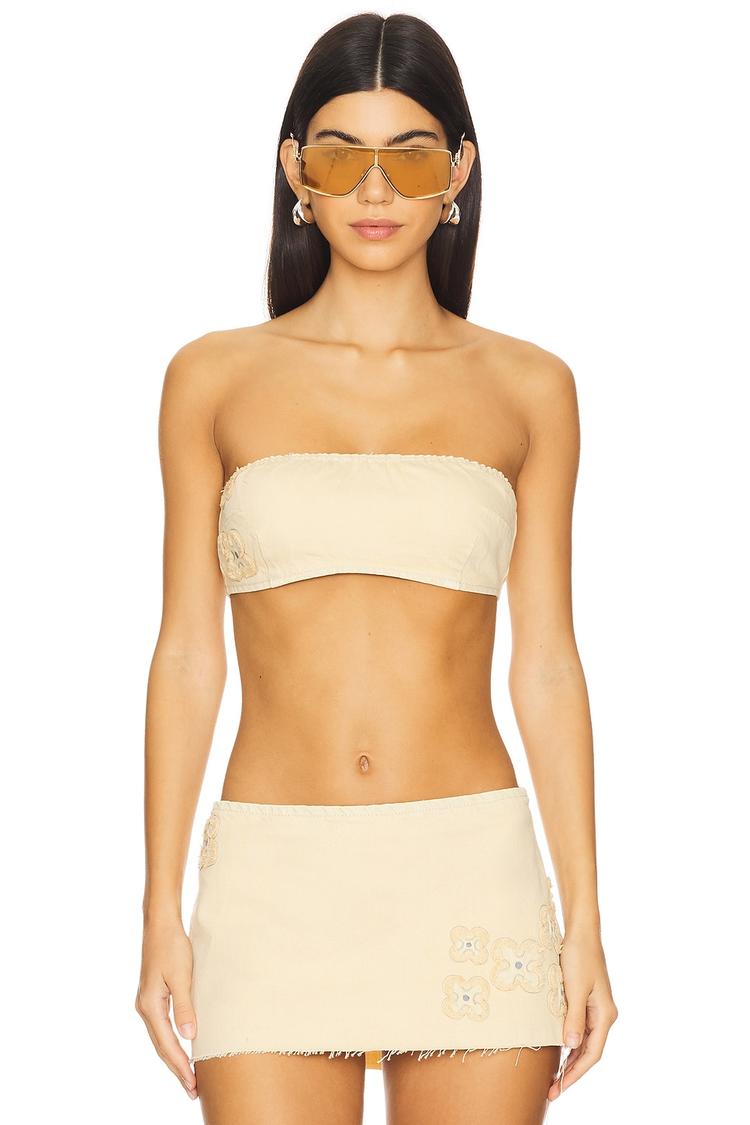 Soft cotton denim in a chic bandeau silhouette offers a fitted, strapless crop top perfect for warm weather. The exposed back zipper closure adds a modern touch, while delicate embroidered florals on the front and back bring subtle bohemian charm. Ideal for casual outings, beach days, and vacation escapes, this beige bandeau blends comfort and trend-ready style effortlessly.