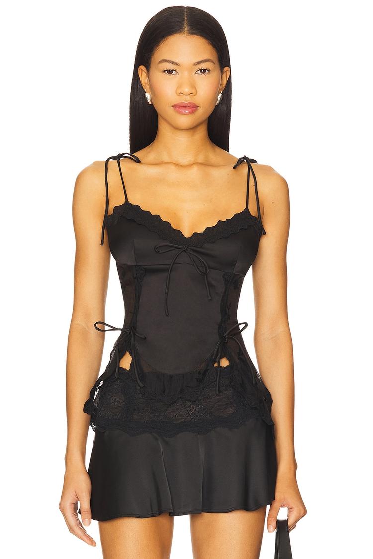 Delicate scalloped lace and tie shoulder straps enhance this fitted camisole crafted from lightweight satin fabric. Its matte black hue and sheer back panels lend an edgy yet elegant vibe, while ruffle accents and bows add romantic charm. Designed with a sweetheart neckline and thigh-length hem, this top is perfect for summer nights out, casual evenings, or date nights. The side zipper and bow closures ensure a flattering fit, making it a chic statement piece that balances sensuality with sophistication.