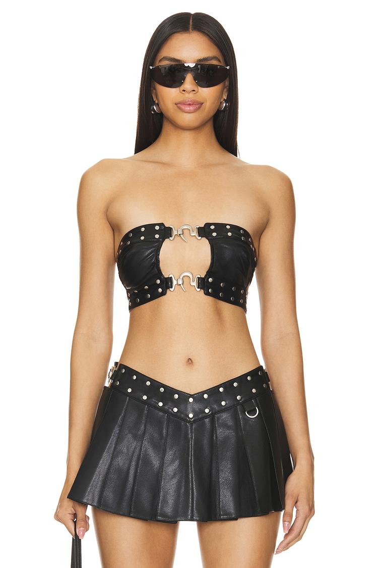 Bold and edgy, this cropped bandeau corset top in matte black polyurethane features a straight neckline and strapless design for a daring silhouette. Silver studs, buckles, and grommets embellish the front and back, creating an industrial-chic vibe. The open back with hook closures ensures a tight fit that contours the body perfectly. Paired with a pleated hem, this top is ideal for summer nights out, parties, and girls' night events, offering a trendy and sexy statement piece for confident styling.