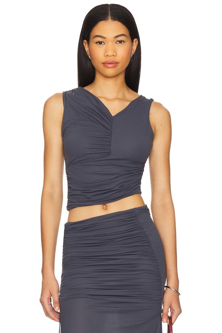 Lightweight stretch jersey fabric forms this modern cropped top with a fitted silhouette that flatters the figure. Featuring a chic V-neck and sleeveless wide straps with an asymmetrical neckline, the design is enhanced by partial ruching all over for texture and interest. The covered back and pullover closure add to its minimalist appeal. Perfect for spring and summer, this top transitions effortlessly from casual days to brunches and date nights, combining contemporary style with comfortable wearability.