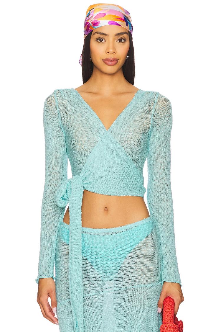 Lightweight knit fabric and a cropped silhouette define this modern wrap top in a soft light blue hue. The long sleeves and V-neckline enhance its sleek, slim fit, while the tie-up closure at the waist adds adjustable styling and a touch of sexy appeal. Its sheer texture offers a beach-ready vibe, making it perfect for casual outings, vacation days, or brunch and night outs where effortless style is key.