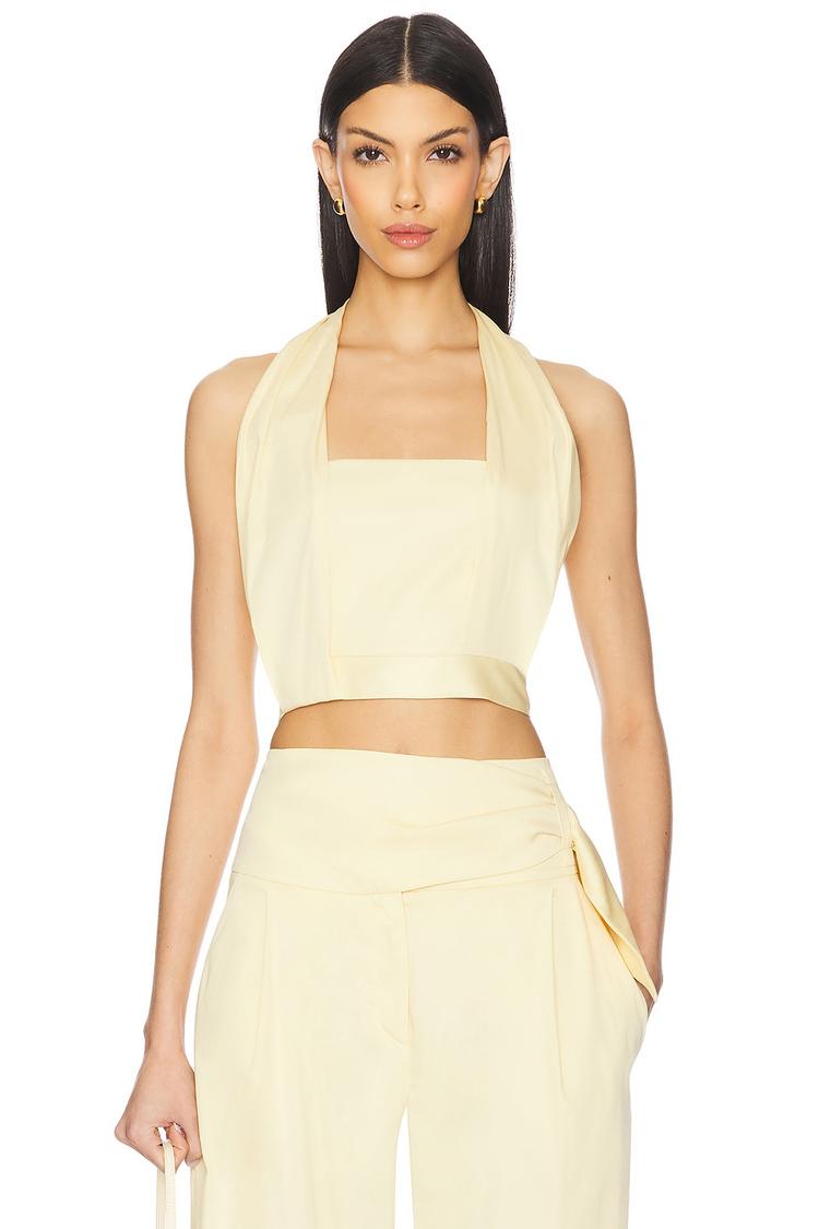 Soft beige cotton blend fabric and a fitted silhouette define this chic cropped top with a halter neck and open back secured by a back zipper closure. Its sleeveless, strapless styling and square neckline create a minimalist yet sophisticated look, perfect for spring and summer. Ideal for casual outings, brunch dates, or stylish day-to-night transitions, this versatile piece embodies understated elegance and modern design.
