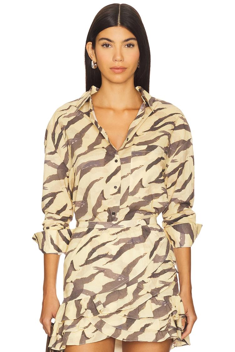 Soft, midweight cotton chiffon shapes this modern shacket with a relaxed fit and long sleeves finished with buttoned cuffs. An abstract all-over beige and brown print complements the hip-length silhouette, while a classic polo collar and front button closure add timeless style. Ideal for casual settings, workwear, and business casual occasions, this versatile piece balances comfort and sophistication with minimalist appeal.