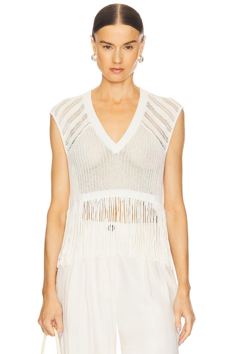 Softly knit from a midweight blend of cotton, nylon, and linen, this sleeveless tank top features a sheer open knit design that exudes effortless bohemian charm. The relaxed regular fit and V-neckline enhance its casual chic appeal, while the delicate fringe detail at the hem adds a playful touch. Ideal for spring and summer days, this hip-length top pairs beautifully with light trousers or skirts, making it perfect for casual outings, brunches, and vacation wear. Slip it on for breathable comfort and understated style.