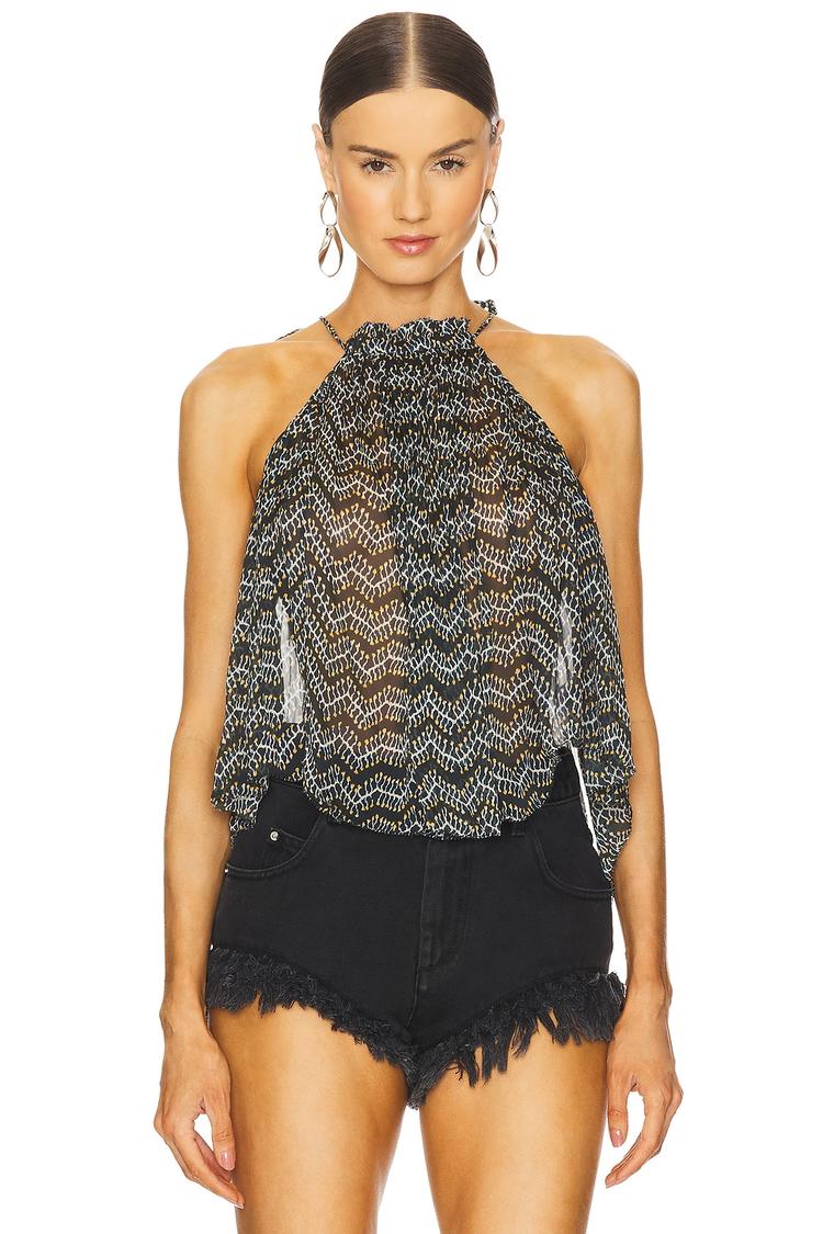 Lightweight chiffon in a semi-sheer black and white chevron pattern creates an airy and stylish Akila Tank with a high neckline and sleeveless design. The loose fit and tie-up shoulder straps add a relaxed, boho chic vibe, perfect for warm spring and summer days. With a hip-length hem and a tie-back closure, this versatile tank pairs effortlessly with casual shorts or skirts for brunch, casual outings, or date nights. Its comfortable viscose fabric and elegant silhouette make it a standout piece for a chic, laid-back look.