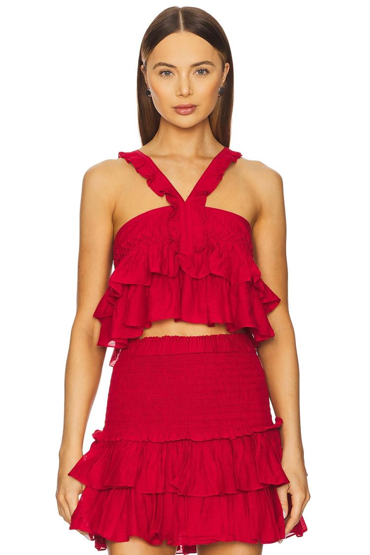 Bright red voile fabric and delicate ruffles define this Daliana Tank, featuring a cropped length and regular fit that flatters effortlessly. The sleeveless tank showcases wide straps and a V-neckline, while a hidden back zipper ensures a seamless silhouette. Ideal for spring and summer, this romantic bohemian piece pairs perfectly with casual outings, brunch dates, or vacation days, offering both style and comfort in breathable cotton and viscose blend.