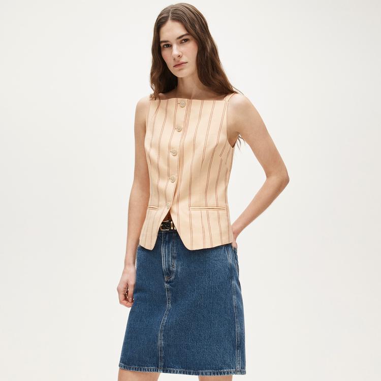 BUTTON-UP CUTAWAY TANK TOP IN STRIPED GRAMERCY LINEN BLEND