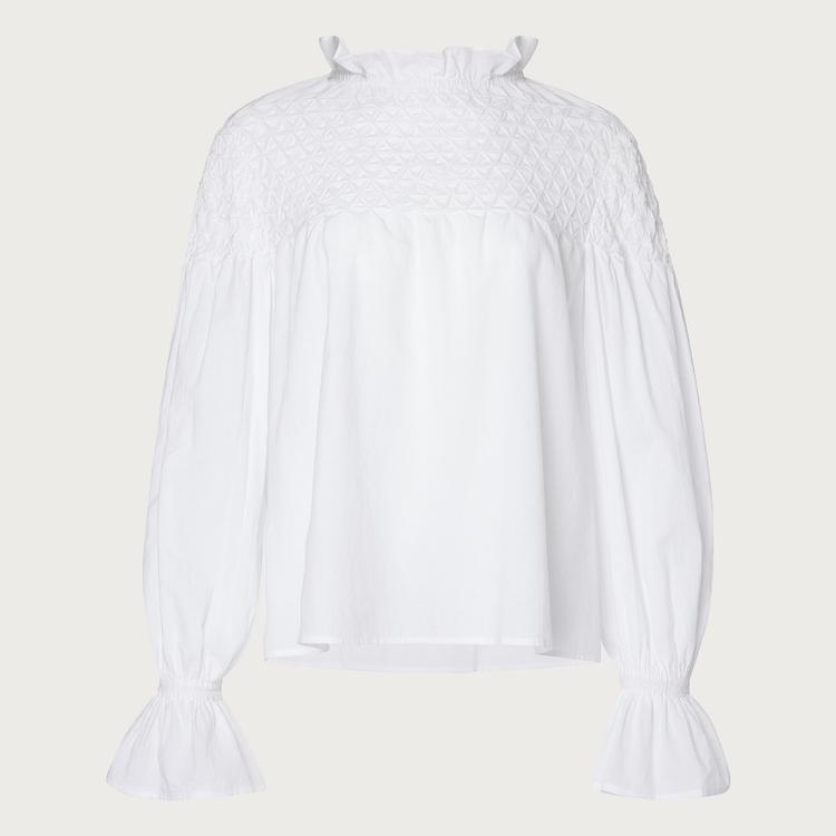 Soft cotton fabric and romantic ruffle accents define this elegant blouson top from J.Crew. Featuring a high neckline with delicate smocking on the collar and bodice, it flows into full bell sleeves finished with ruffled cuffs. Its relaxed fit and hip length make it a versatile choice for casual brunches, workwear, or spring and autumn outings. The pristine white hue adds a timeless touch, perfectly blending classic style with modern comfort for effortless day-to-evening wear.