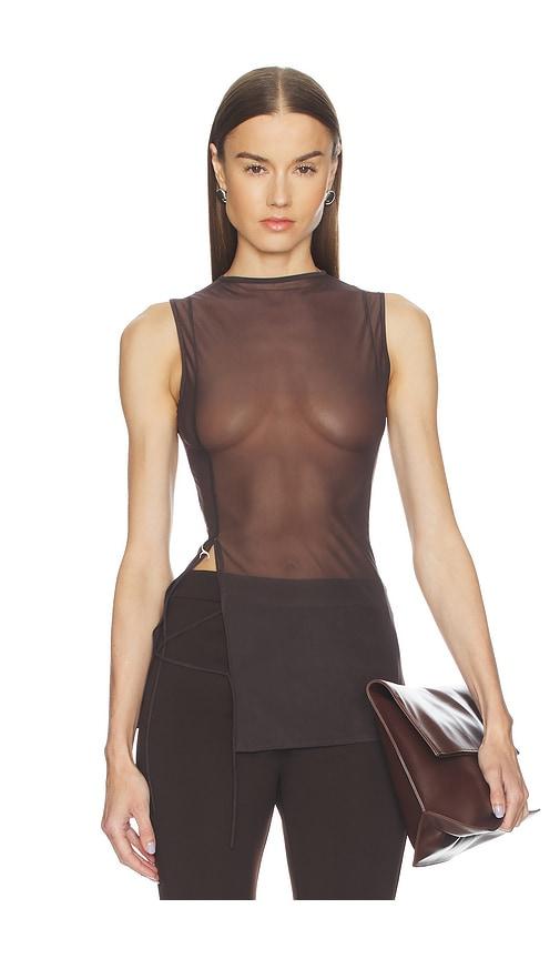 JADE CROPPER SHEER SLEEVELESS TOP IN BROWN.