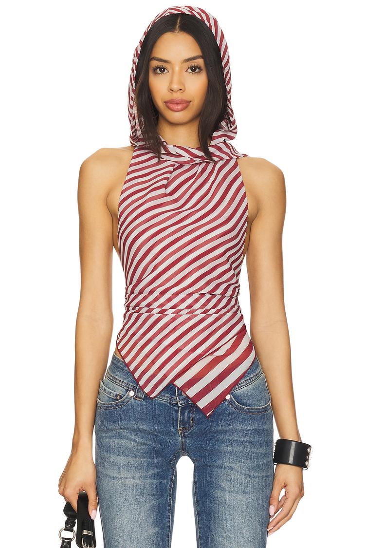 Soft chiffon fabric drapes elegantly in this slim-fit tank top featuring a high neckline and sleeveless, strapless styling. The dusty rose and white diagonal stripes create a chic pattern all over, enhanced by a trendy hood and an open back with tie-up closure for a bold statement. Its asymmetric hem adds a modern edge. Ideal for summer and spring, this waist-length top is perfect for casual outings, night outs, or brunch dates, effortlessly blending comfort with fashion-forward design.