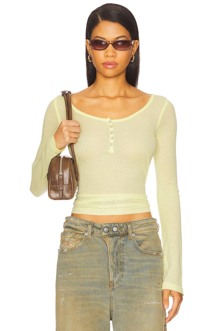 Softly ribbed and sheer with a delicate scoop neckline, this lightweight Henley top features a slim fit and long sleeves for a flattering silhouette. The partial mother-of-pearl button closure adds subtle detail, while the waist-length cut makes it versatile for layering or wearing solo. Crafted from a polyester-viscose blend, this pastel yellow top suits casual, everyday, and loungewear occasions, perfect for spring through autumn. Its minimalist design and breathable fabric offer effortless style and comfort for relaxed days and laid-back gatherings.