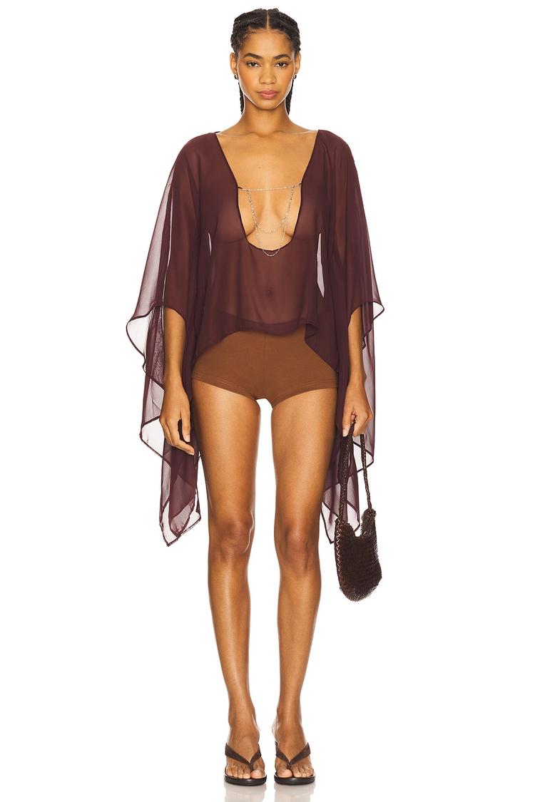 Lightweight mesh fabric and an airy silhouette define this Cape Top by Jaded London, crafted in a matte dark brown hue. Featuring a deep neckline and loose fit, it offers a breezy, asymmetrical hem with elegant cape sleeves that drape effortlessly. The sheer, pullover design provides a relaxed, bohemian vibe perfect for casual outings, beach days, or vacation wear during spring and summer. Its minimalist style pairs seamlessly with various looks, making it a versatile addition to any warm-weather wardrobe.