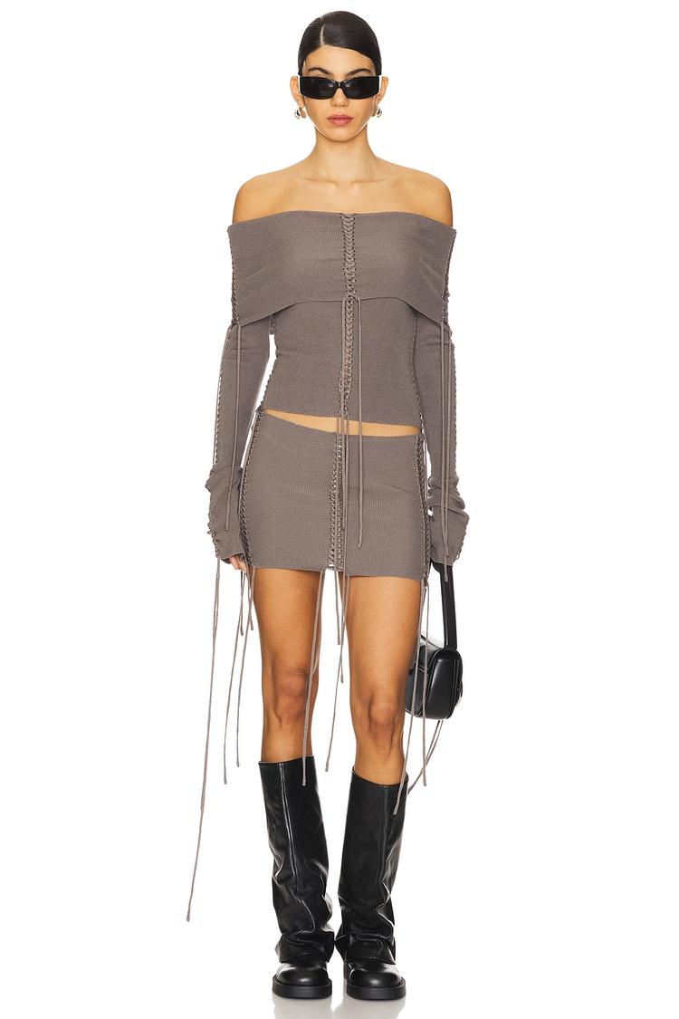 Sleek and edgy, this cropped knit top features a matte taupe hue with an off-shoulder foldover neckline that elegantly drapes across the shoulders. The slim fit silhouette is enhanced by long cuffed sleeves detailed with lace-up ties, adding a trendy, street-style vibe. Crafted from a soft viscose-polyester blend, it promises comfortable wear with a slinky jersey texture. Ideal for casual days, brunch dates, or nights out, this versatile piece brings a bold yet sophisticated touch to your autumn, winter, and spring wardrobe.