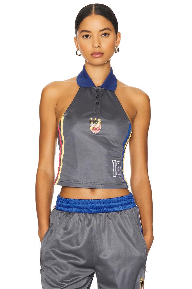 Sporty and sleek, this cropped halter polo top features a slim fit crafted from lightweight polyester jersey for breathable comfort. The halter neck and strapless sleeve styling emphasize an open back silhouette, while the partial front button closure adds a classic touch. Bold side stripes in blue, pink, and yellow contrast the matte gray base, complemented by a front graphic emblem. Ideal for casual streetwear, festivals, and summer outings, this trendy tank top blends athletic vibes with modern style for versatile warm-weather wear.