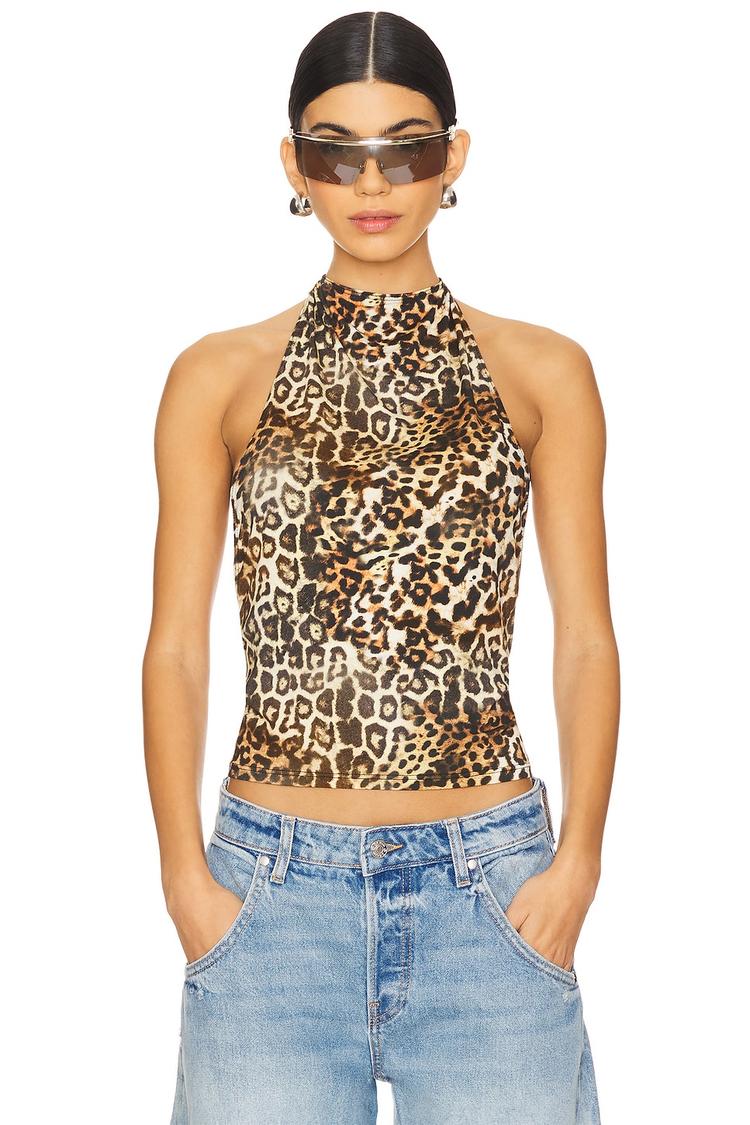 Leopard print energizes this slim-fitting halter neck tank crafted from lightweight viscose and elastane jersey. The sleeveless silhouette features a chic open back with a buckle closure that adds an edgy vibe. Falling to the waist length, this trendy top is perfect for spring and summer outings, from casual brunches to stylish nights out. Its breathable fabric and eye-catching animal pattern make it a versatile statement piece for your wardrobe.