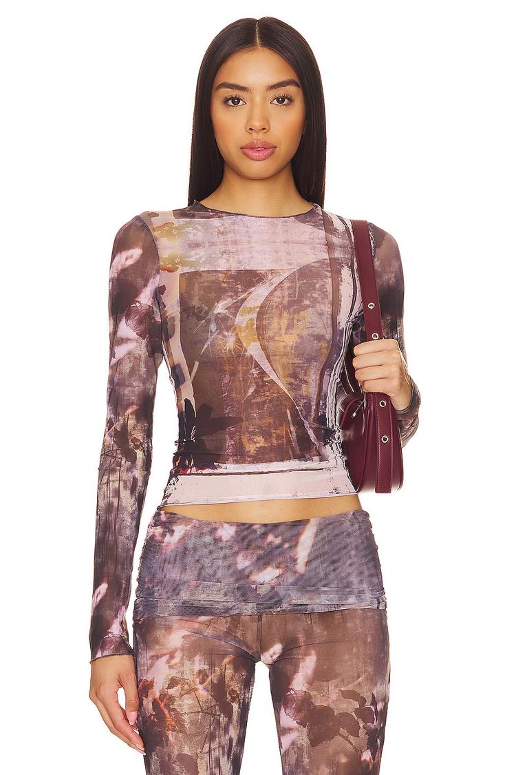 Lightweight mesh fabric and a slim fit bring a contemporary edge to this longline top. Featuring an all-over abstract print in matte brown, pink, purple, and beige tones, it pairs a classic crew neck and long regular sleeves with a slightly sheer texture for a trendy, street style vibe. Ideal for casual outings, streetwear ensembles, or night out and festival looks, this pullover top combines breathable polyester and elastane for comfort and stretch. The hip-length hem offers versatile styling options to elevate your seasonal wardrobe.
