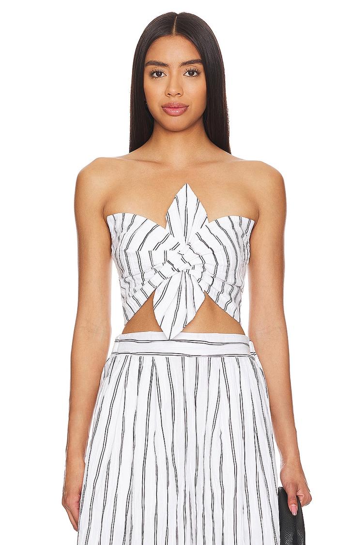 A crisp, fitted cropped top crafted from a midweight voile blend of cotton, polyester, and spandex offers breathable comfort and subtle stretch. Featuring a strapless straight neckline and sleeveless styling, this minimalist piece is elevated by a twisted ruffle detail at the front that adds a touch of casual chic. The all-over black stripe pattern on a white base enhances its fresh spring and summer vibe. Perfect for casual outings, brunches, or vacation days, this Clementine Top pairs effortlessly with high-waisted bottoms for an easy, stylish look.