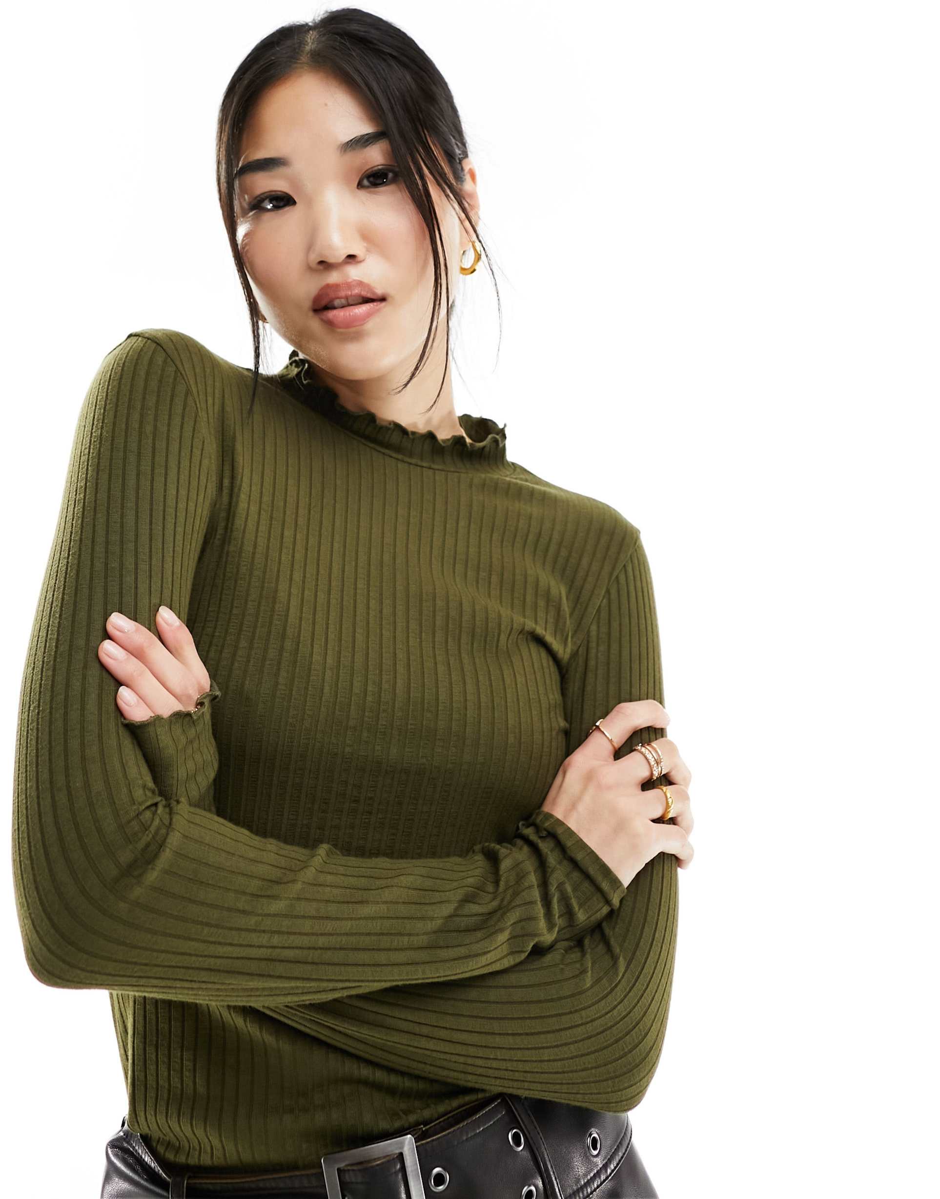 JDY HIGH NECK LETTUCE EDGE TOP IN KHAKI