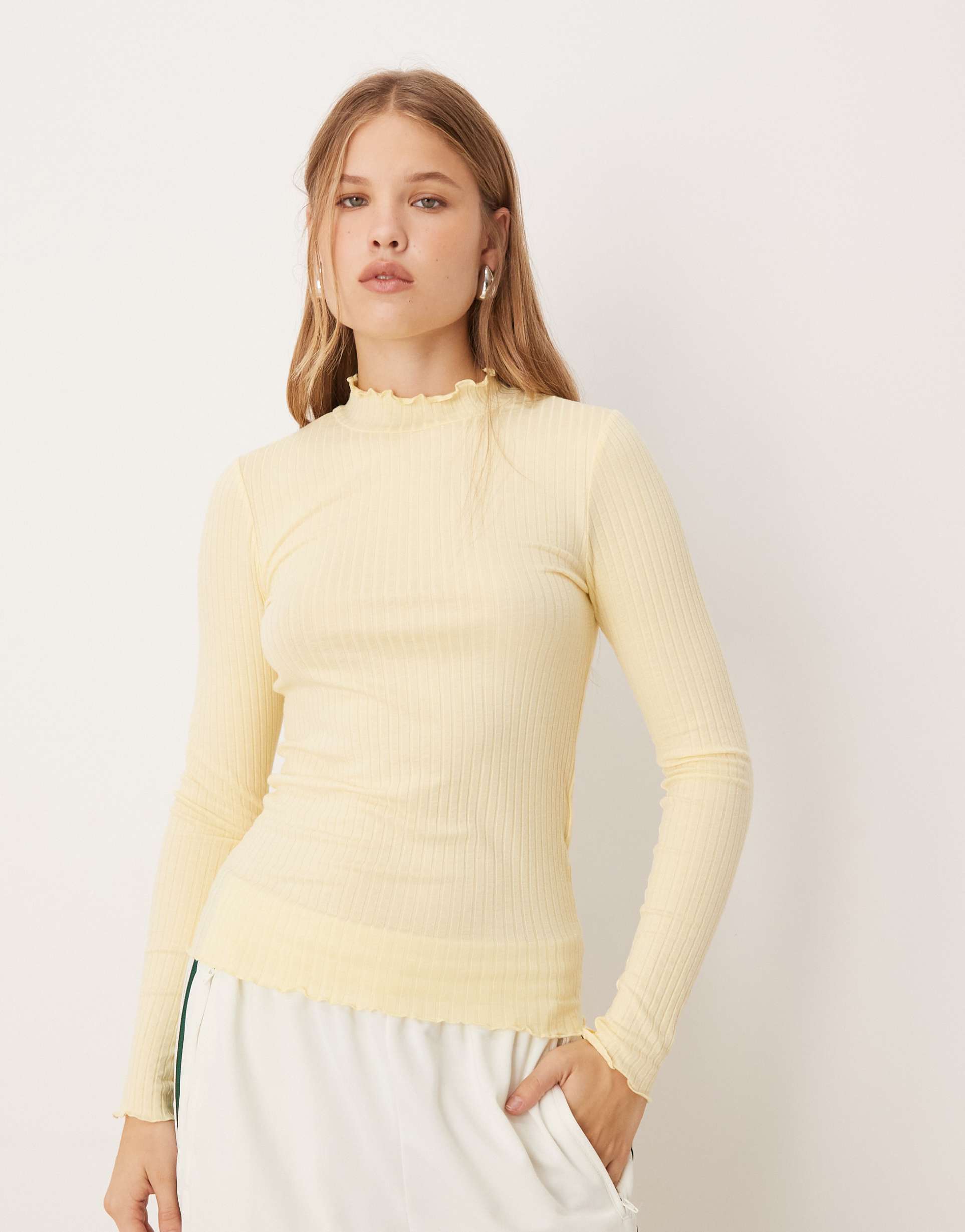 Soft ribbed jersey fabric meets a slim silhouette in this butter-yellow long sleeve shell top. Featuring a delicate lettuce-edge trim at the high neck and cuffs, it offers a subtle ruffle detail that elevates its minimalist, classic style. The stretchy knit blend of viscose, cotton, and elastane ensures comfortable wear throughout spring, autumn, and winter. Its hip length and fitted cut make it perfect for casual days, workwear, or business casual occasions where understated elegance is key.