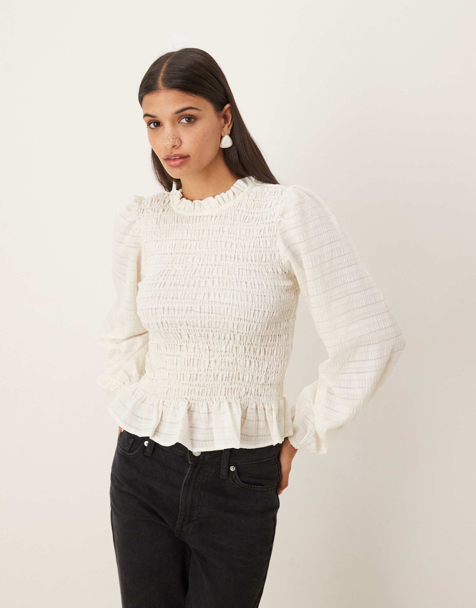 Delicate smocking and ruffled peplum hem define this classic white top, crafted from a soft viscose-polyester blend with a textured finish. The high neck and long sleeves offer elegant coverage, while the regular fit ensures comfortable wear. Ideal for autumn to spring, this hip-length peplum top pairs effortlessly with tailored trousers or jeans, making it perfect for casual days, workwear, or business casual settings. Its minimalist and refined silhouette adds a sophisticated touch to your everyday and brunch outfits.