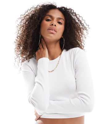 Soft rib-knit cotton and elastane blend creates a slim, comfortable fit in this cropped top, featuring a classic crew neck and long regular sleeves. Its minimalist solid white design lends versatility perfect for casual outings, everyday wear, or relaxed brunches. The cropped length and stretchy jersey fabric ensure ease of movement and style that pairs well with high-waisted bottoms for a modern, clean look.