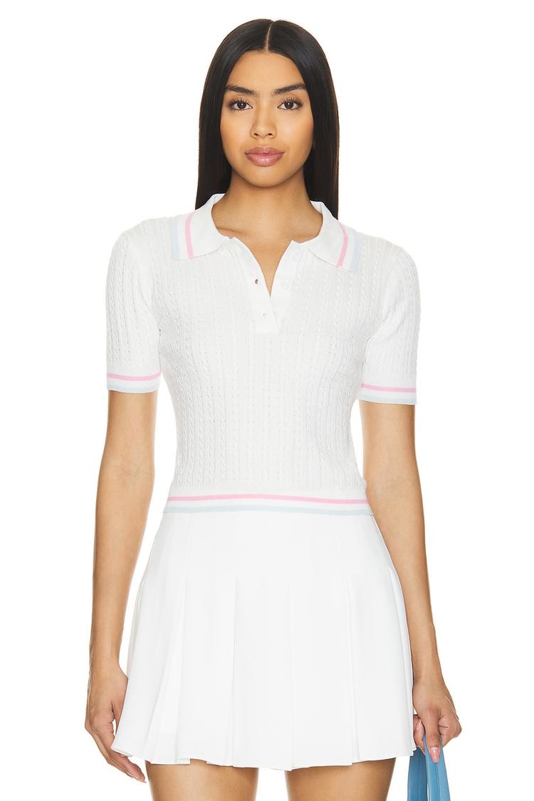 Lightweight cable knit fabric and a classic polo collar define this fitted Taylor Top by John & Jenn By Line. Featuring half sleeves and a partial front button closure, the waist-length silhouette offers a refined, minimalist look enhanced by subtle pink trim accents. Ideal for casual days, brunch meetups, or polished workwear, this rib knit top blends comfort with timeless style suitable for spring and summer seasons.