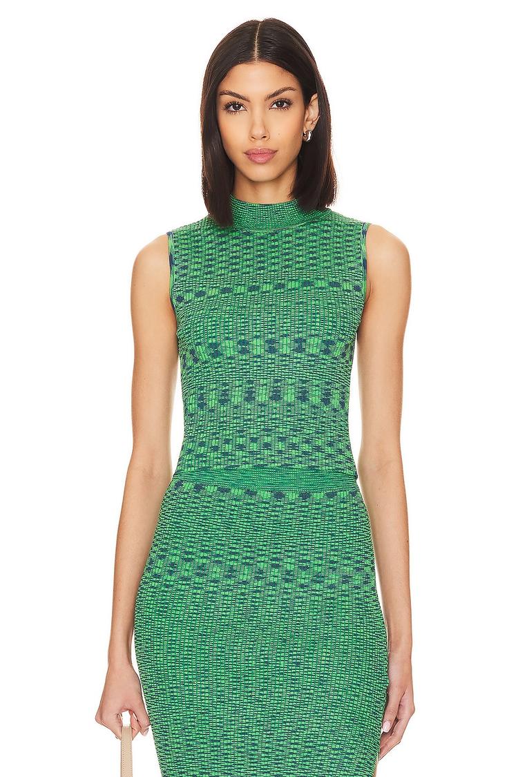 Ribbed knit fabric in a vibrant green hue defines this fitted tank top with a high neck and sleeveless strapless styling. The geometric all-over pattern adds subtle texture and visual interest while maintaining a minimalist, classic silhouette at hip length. Crafted from a viscose-polyester blend, this versatile piece is ideal for casual days, workwear, and business casual settings, as well as brunch outings during spring and summer. Its pullover closure and comfortable fit make it a practical and stylish addition to any wardrobe.