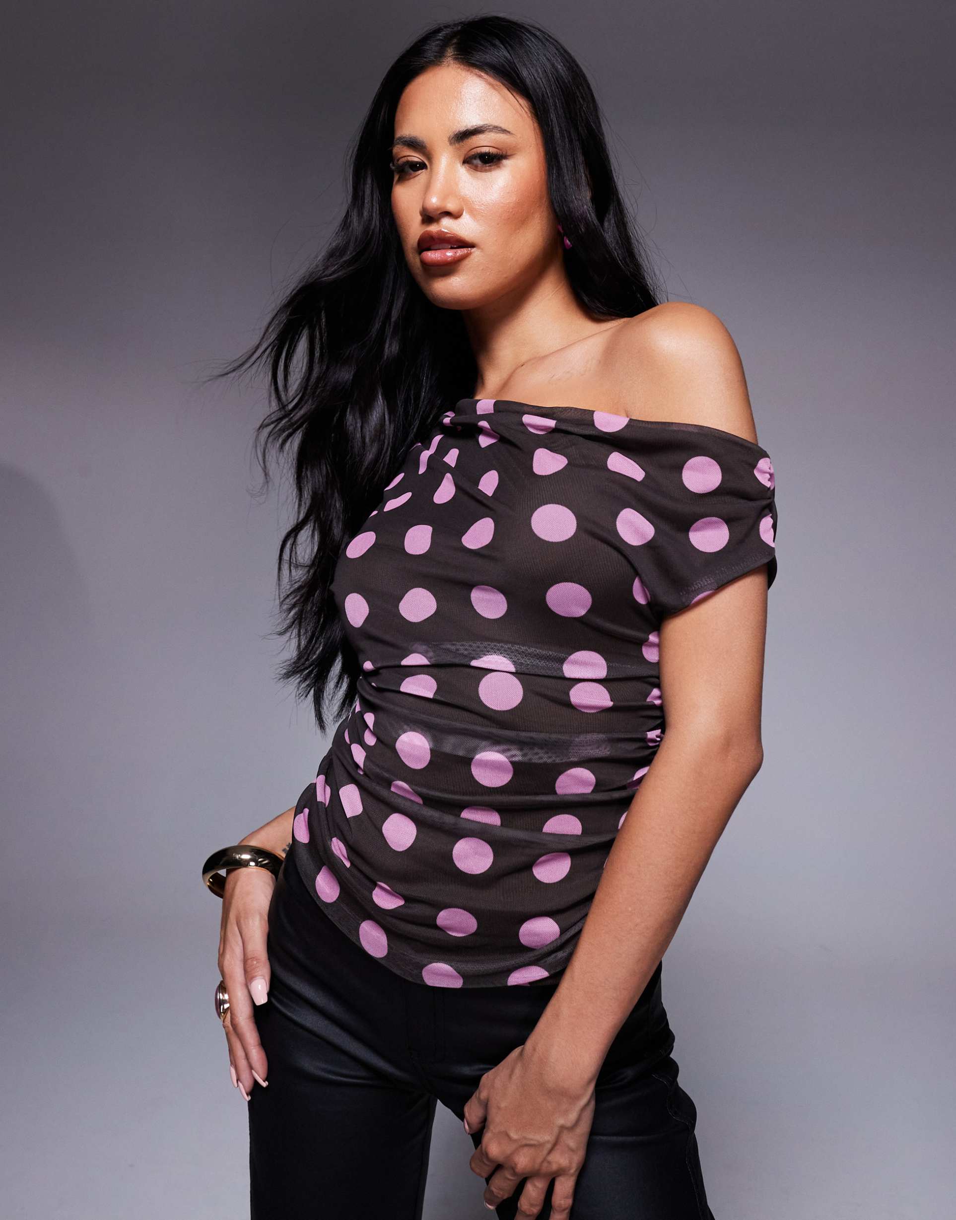 Soft and sheer mesh fabric brings a delicate touch to this off-shoulder shell top with a flattering regular fit. The hip-length silhouette features a charming pink polka dot pattern on a matte brown base, complemented by short half sleeves and elegant front draping. Ideal for casual days, date nights, or lively nights out, this trendy and chic piece adds a playful yet sophisticated vibe to your wardrobe.