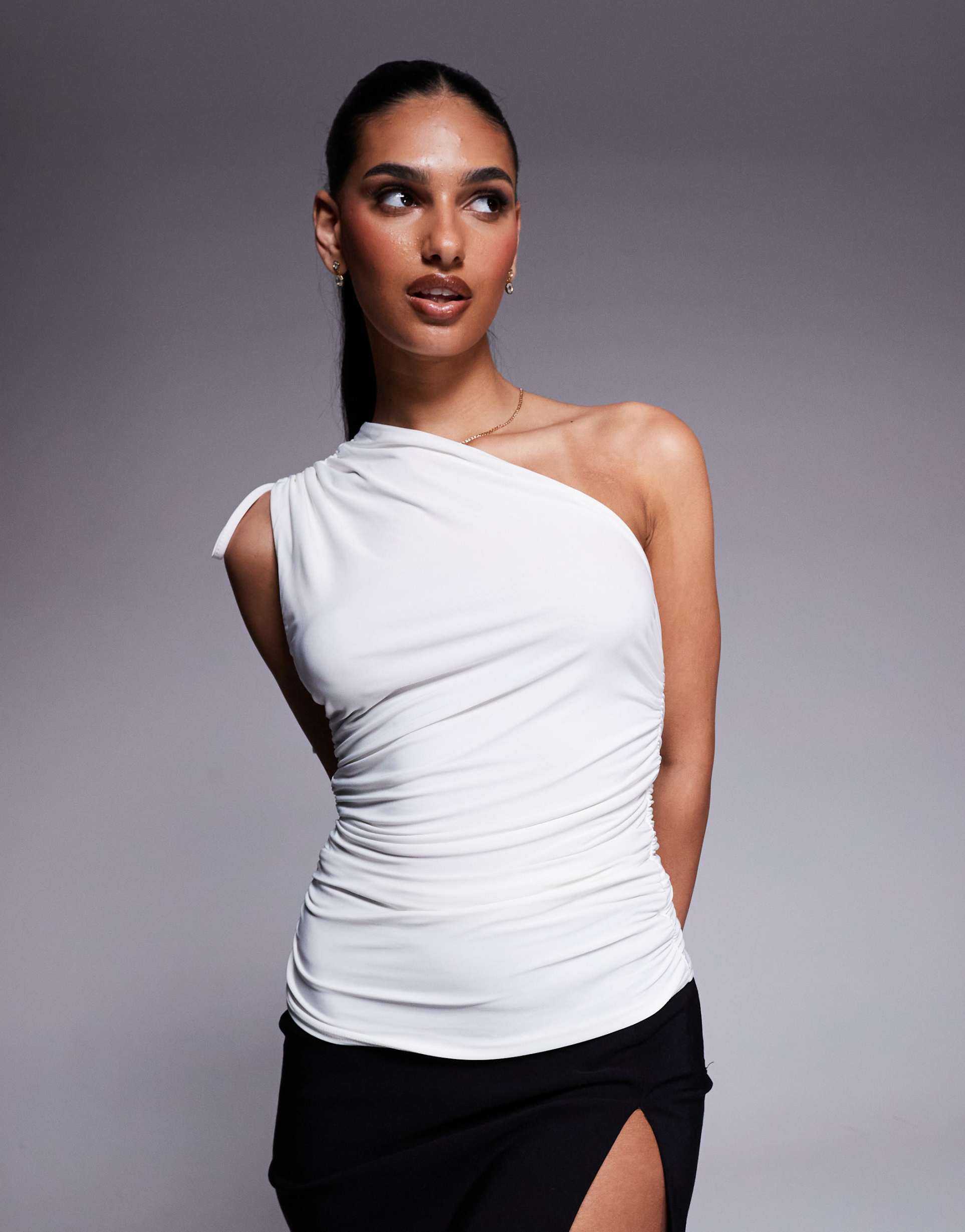 Sleek and sophisticated, this white camisole features a striking asymmetric neck and one-shoulder strapless design that flatters with its slim fit silhouette. The double-layered, super-smooth slinky fabric made from polyester and elastane offers a stretchy, clingy feel that enhances comfort and style. Ruched sides with a delicate tie-up detail add texture and visual interest, making it a perfect choice for casual outings, date nights, or night out events. Waist-length and effortlessly chic, this top elevates modern minimalism with a sexy edge.
