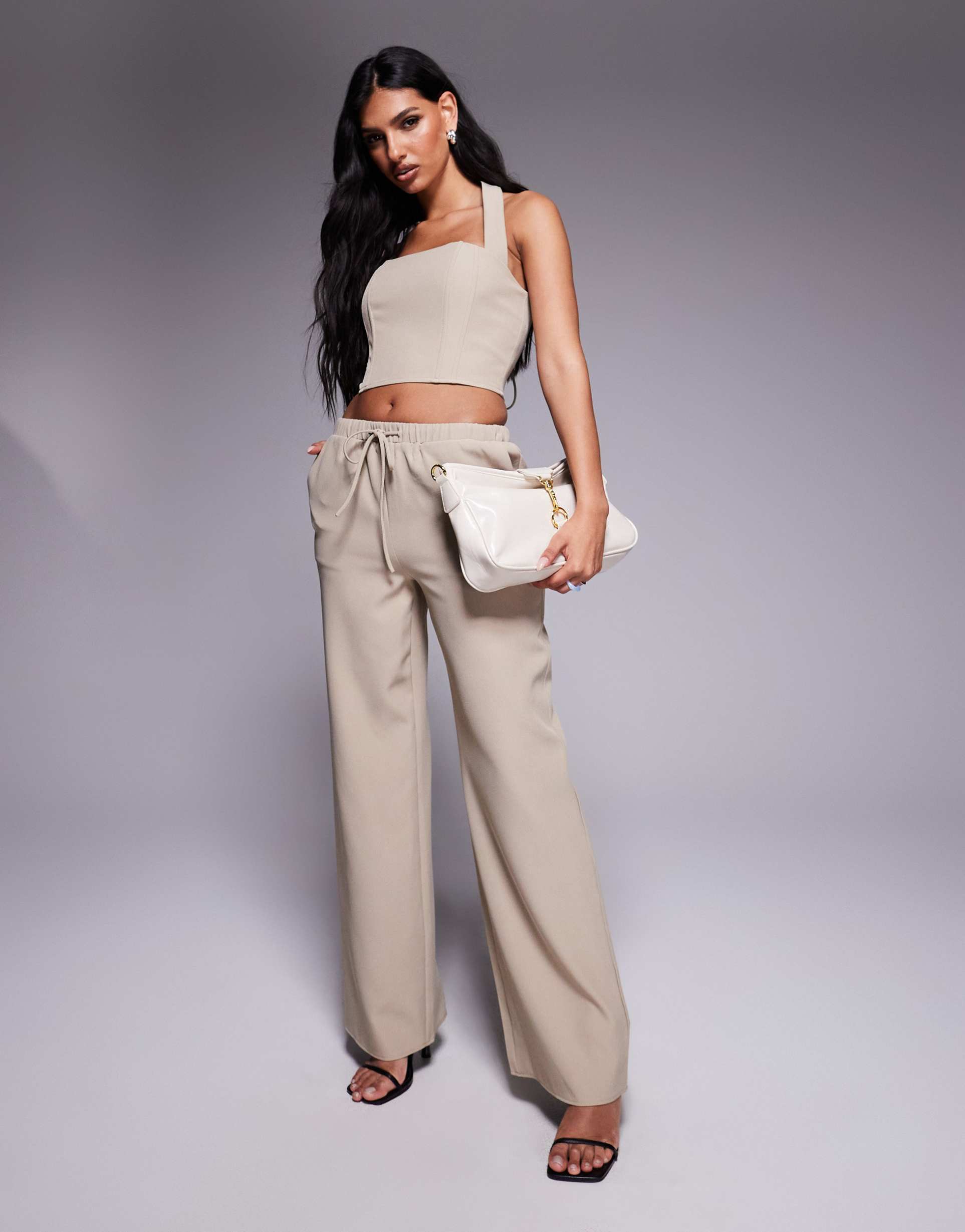 KAIIA EXCLUSIVE LACE UP BACK HALTERNECK TOP IN STONE - PART OF A SET