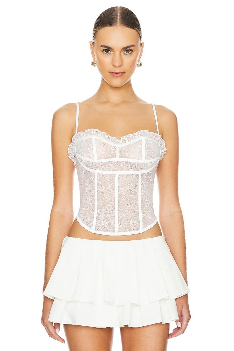 Delicate white lace and structured boning combine in this fitted corset top featuring a straight neckline and slender spaghetti straps. The waist-length silhouette is enhanced by a back lace-up tie closure, creating a flattering hourglass effect. Perfect for spring and summer nights out, date nights, or stylish parties, this elegant piece adds a modern, sexy touch to any ensemble. The sheer nylon lace fabric offers a lightweight feel while showcasing intricate lace trim details all over, making it a standout addition to your evening wardrobe.