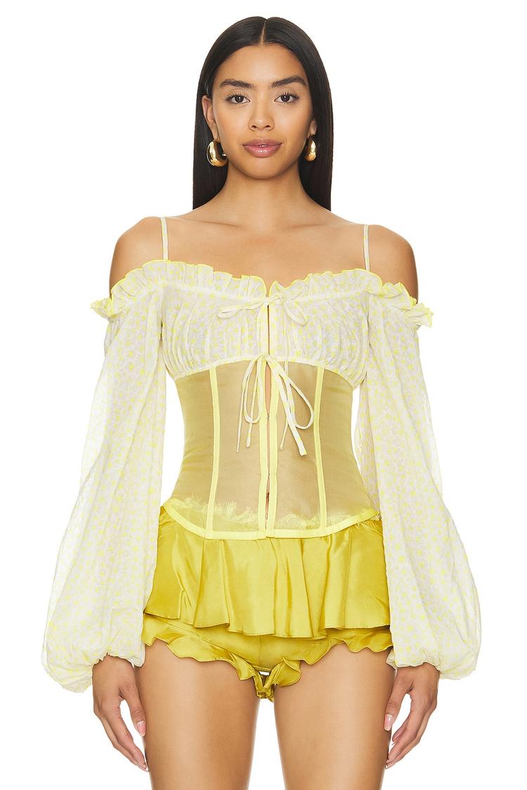 Soft silk and delicate balloon sleeves define this romantic corset top with an off-shoulder neckline and ruffled border details. The fitted silhouette with boned bodice and hidden front hook closures offers elegant structure while the sheer panels add a subtle allure. Waist-length and airy, this versatile piece shines in spring and summer settings, perfect for casual outings, brunch dates, or intimate evening wear. Its light yellow hue radiates warmth and sophistication, making it a chic addition to refined wardrobes.