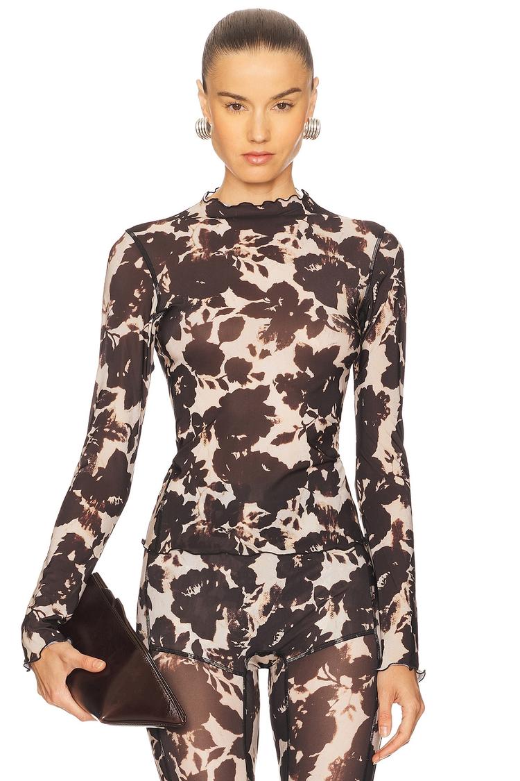 Lightweight polyester blend with elastane forms this modern base layer featuring a close fit and long sleeves. The mock neck and hip-length silhouette combine with an abstract all-over print in matte beige and black for a minimalist street style vibe. Lettuce trim ruffles detail the borders adding subtle texture. Pullover design ensures easy wearability. Versatile for casual days, streetwear looks, or travel essentials, this piece offers sleek coverage with a contemporary edge.