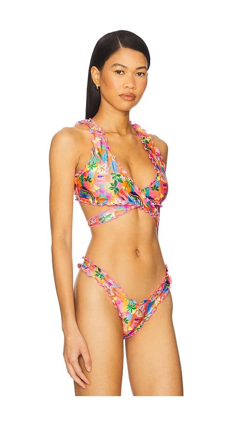 KULANI KINIS LETTUCE EDGE WRAP BIKINI TOP IN ORANGE.