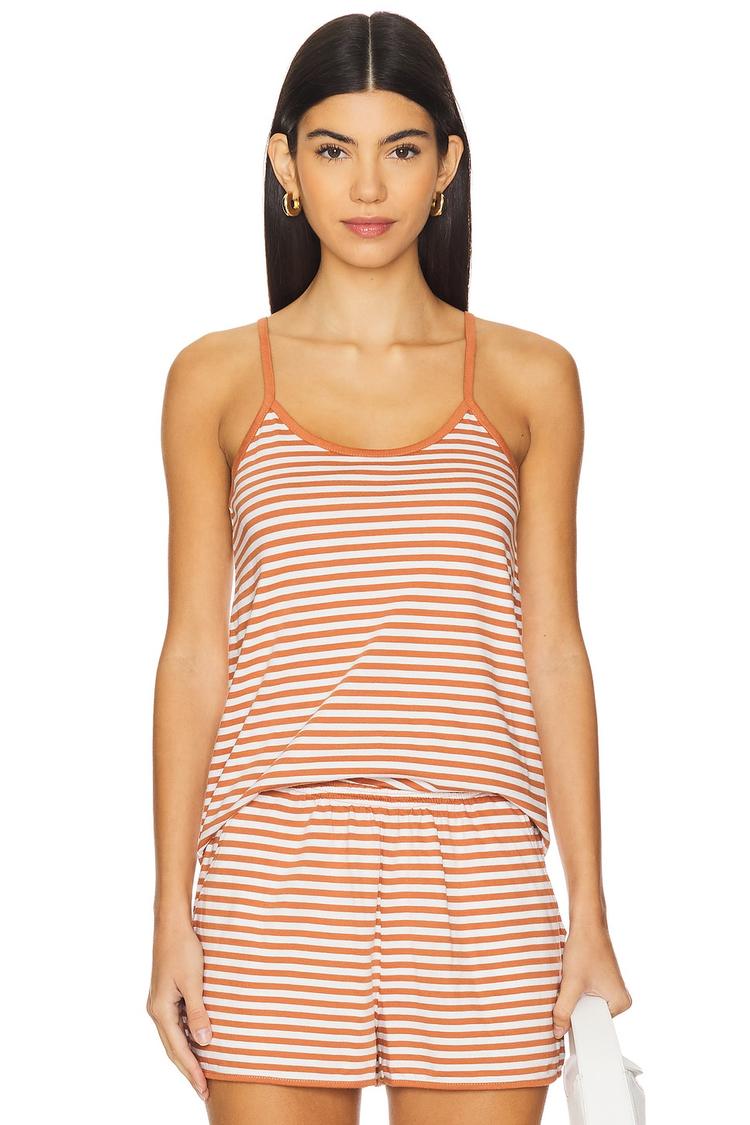 Soft cotton fabric and a relaxed fit define this hip-length tank top, featuring classic spaghetti straps and a scoop neckline for easy, breezy wear. The light tan and white stripes run all over the piece, giving it a minimalist yet chic vibe perfect for casual days, lounging at home, or restful sleep. Its sleeveless design and slip-on closure enhance comfort and simplicity, making it an ideal choice for spring and summer seasons. Versatile and effortlessly stylish, it suits everyday casual wear, loungewear, and sleepwear occasions.