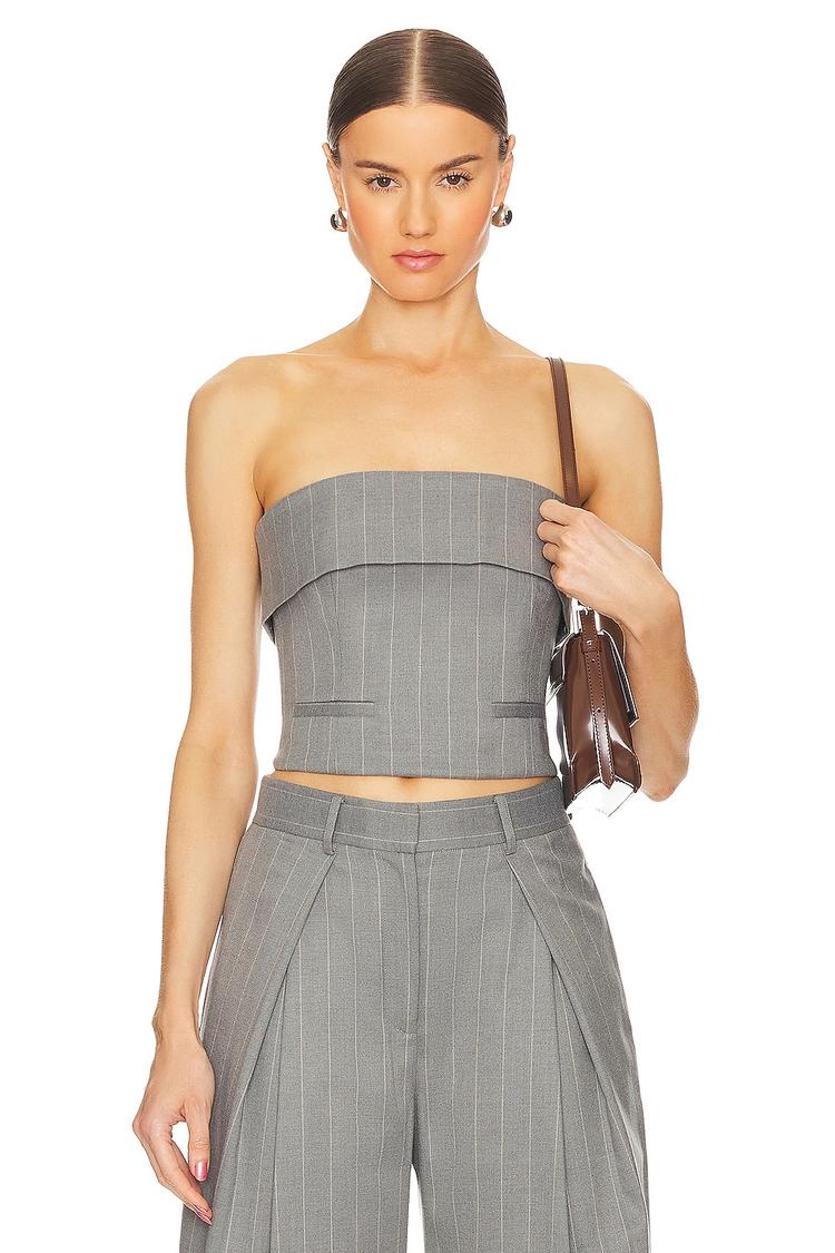 Sharp tailoring meets timeless elegance in this cropped corset top crafted from twill suiting fabric. Featuring a fitted silhouette with structured boning and a foldover straight neckline, this strapless piece boasts a subtle striped pattern in matte gray with white pinstripes. A concealed back zipper ensures a sleek finish, making it ideal for workwear, business casual settings, or chic brunch and night out occasions. Designed for all-weather versatility, it pairs perfectly with high-waisted trousers or skirts for a sophisticated, modern look.