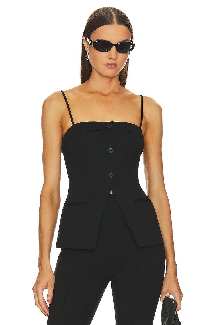 Sleek and sophisticated, this fitted corset top features a straight neckline and delicate spaghetti straps for an elegant silhouette. Crafted from a midweight matte black jersey fabric blend of rayon, nylon, polyester, and elastane, it offers subtle stretch and structure. The waist-length design with faux front button accents and a hidden side zipper closure adds refined detail, making it perfect for workwear, business casual, brunch, or a chic night out. Embrace modern elegance with this versatile and polished piece.
