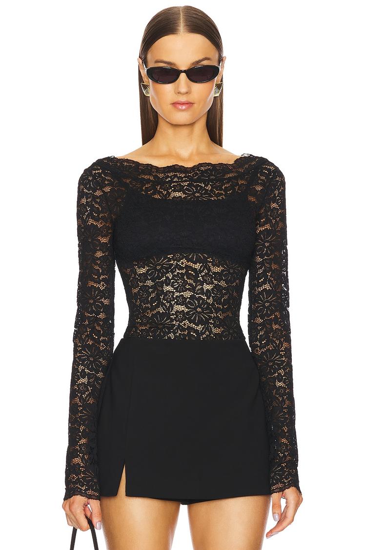 Delicate matte black lace envelops this fitted shell top, featuring long regular sleeves and a classic round neckline. The waist-length hem with a slight front slit adds a subtle edge to the elegant, sheer design. Crafted from a blend of nylon, cotton, and elastane, it offers lightweight comfort with a sophisticated silhouette. Ideal for date nights, cocktail events, and night outs, this chic piece combines sensuality and refinement effortlessly, making it a versatile addition to your semi-formal wardrobe.