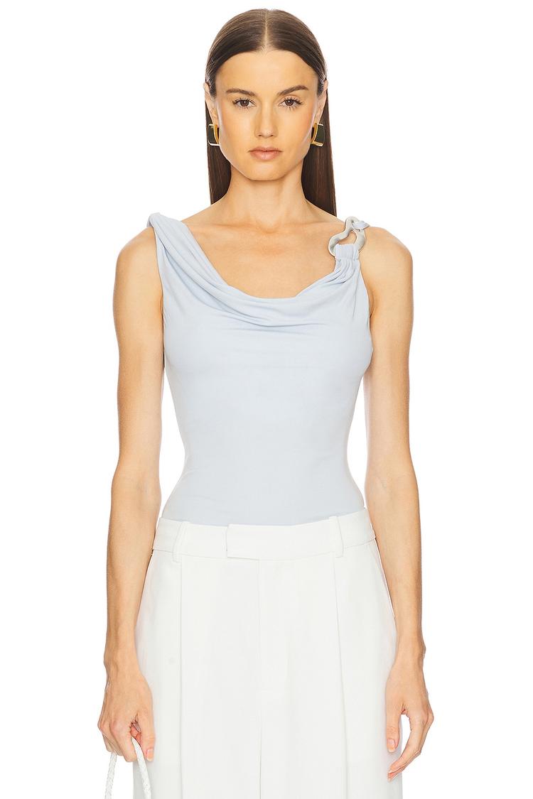 Soft drape and a fitted silhouette define this elegant tank top in a light blue midweight crepe fabric. Featuring a graceful cowl neck and wide straps adorned with silver-tone metal details on the shoulder, it offers a subtle yet sophisticated charm. The lined bust provides comfortable support, making it an ideal choice for spring and summer occasions such as casual outings, brunches, and date nights. Its minimalist style and waist-length cut ensure versatility for layering or wearing alone with ease.