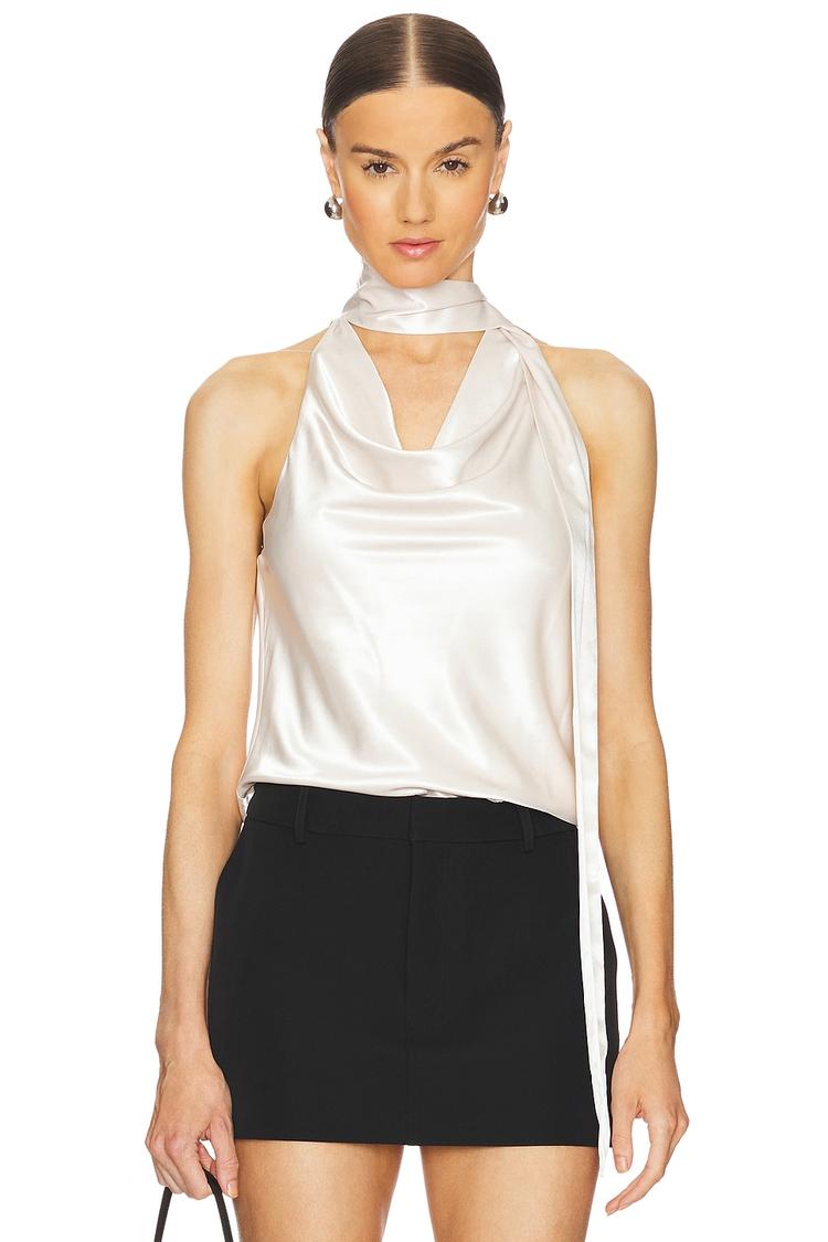 Luxurious satin fabric and a flattering cowl neck define this sleeveless tank top with an attached scarf detail at the collar. Its regular fit and hip-length silhouette make it versatile for warm-weather occasions like brunch, casual outings, or date nights. The minimalist design is elevated by the elegant ribbon-like scarf, adding a chic touch to your ensemble. Perfect for pairing with skirts or tailored pants, this polished top blends comfort and style seamlessly.