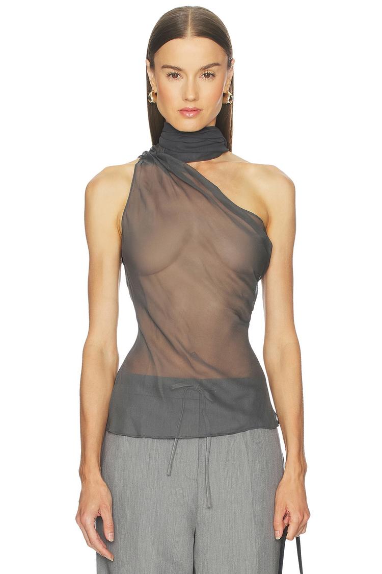 Soft matte black silk combines with delicate draping to create a slim-fitting halter neck shell top that exudes modern elegance and sophistication. The sheer fabric overlay adds a sensual touch, while the sleeveless silhouette and hip length make it perfect for warm spring and summer nights. Ideal for cocktail parties, date nights, or a night out, this top pairs seamlessly with tailored pants or skirts for a confident, chic look.