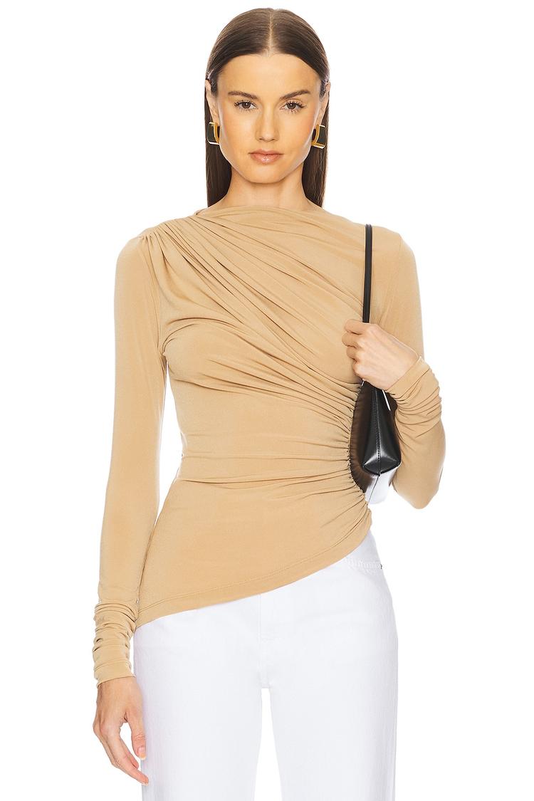 Soft matte beige polyester-elastane jersey forms a sleek longline top with a modern high neck and long fitted sleeves. Side ruching adds flattering texture and an elegant asymmetrical drape that contours the silhouette, enhancing the hip-length hem. This minimalist chic piece pairs effortlessly with trousers or skirts, making it perfect for casual outings, workwear, or stylish brunches. Its fitted silhouette and subtle design details create a refined yet comfortable look suitable for autumn and winter seasons.