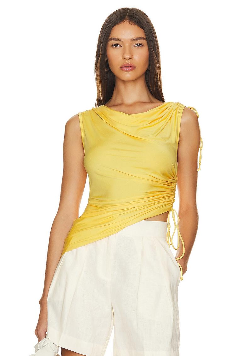 Bright yellow slinky jersey fabric shapes this chic camisole with a draped neckline and sleeveless silhouette. The slim fit is enhanced by ruched drawstring details on the shoulders and sides, creating a flattering, adjustable fit that sits at waist length. Ideal for warm seasons, this versatile top pairs effortlessly for casual outings, brunch dates, or relaxed evenings. Crafted from a comfortable rayon-elastane blend, it offers both stretch and softness for everyday elegance.